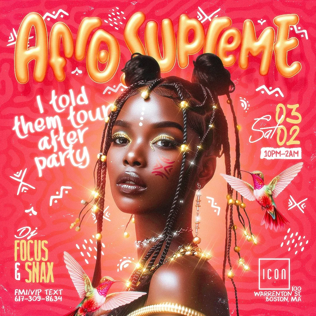 Afro Supreme Saturday, March 2, 2024 10:00 PM 22:00 Sunday, March 3, 2024 2:00 AM 02:00 Icon Nightclub 100 Warrenton Street Boston, MA, 02116 United States (map) Google Calendar ICS FOCUS & SNAXVIP/FMI TEXT 617-309-8634 Buy Tickets on Eventbrite Buy Tickets