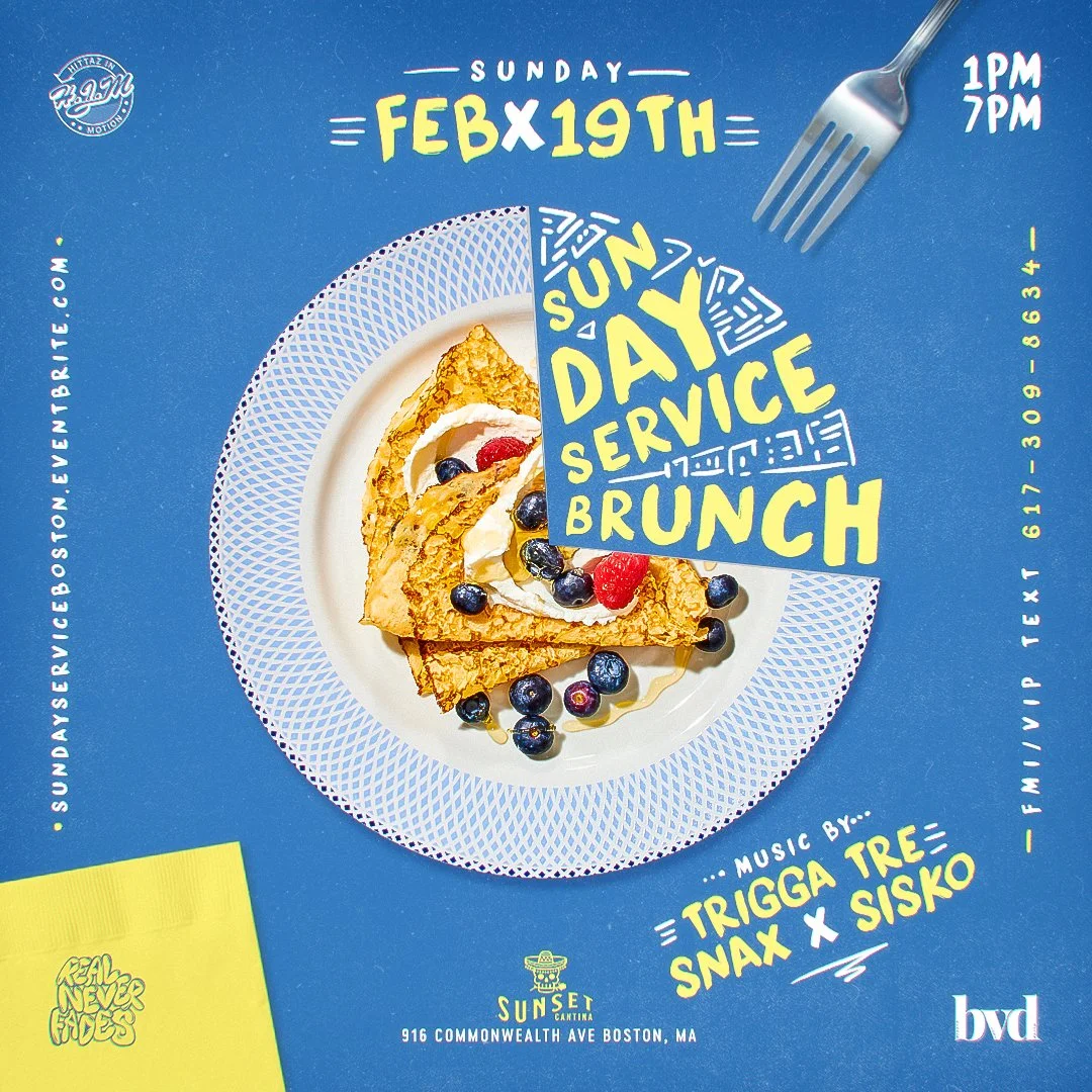 Sunday Service Brunch Sunday, February 19, 2023 1:00 PM 7:00 PM 13:00 19:00 Sunset Cantina 916 Commonwealth Avenue Boston, MA, 02215 United States (map) Google Calendar ICS SNAX x SISKO x TRIGGA TREVIP/FMI TEXT 617-309-8634 Buy Tickets on Eventbrite Buy Tickets