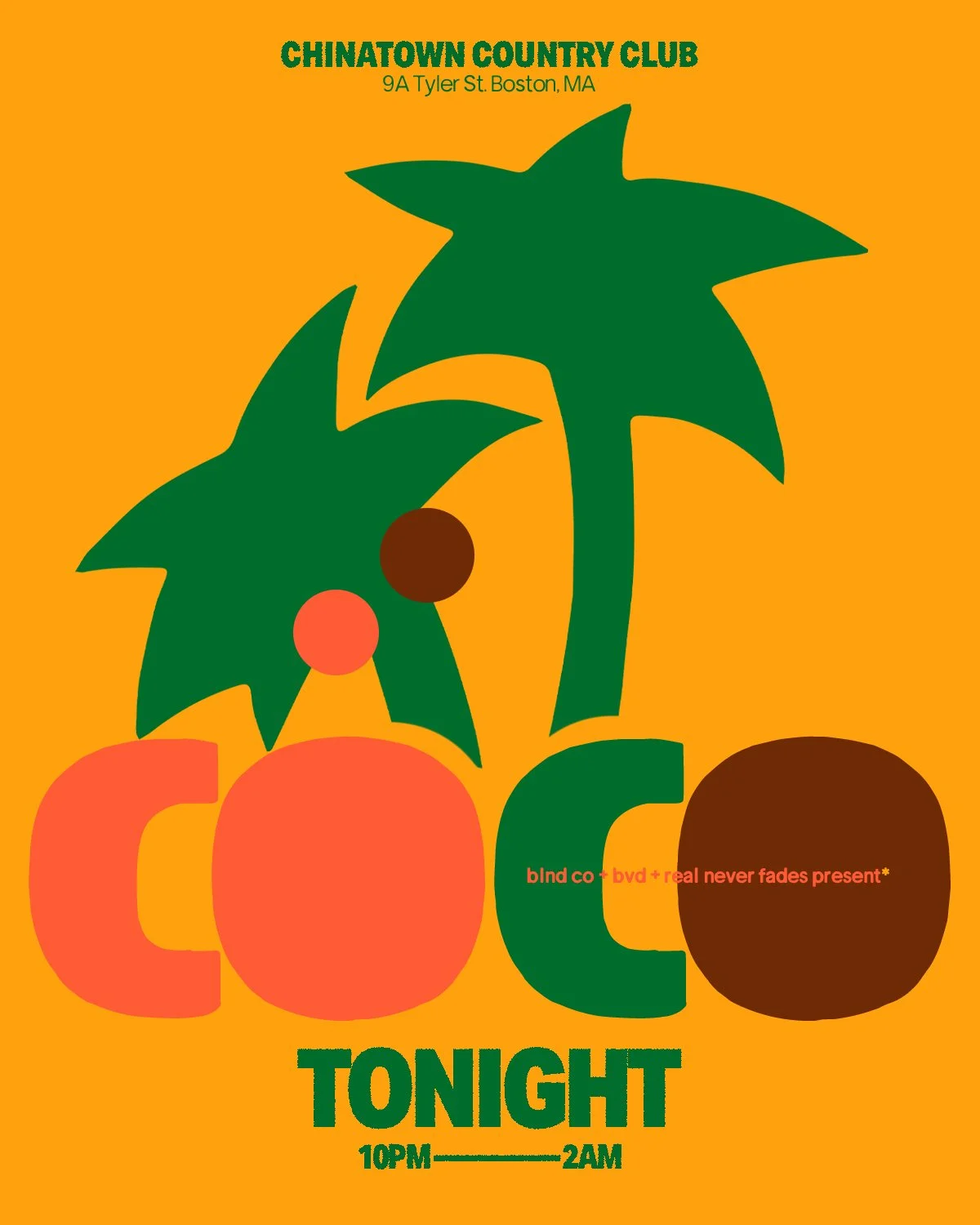 COCO Friday, April 5, 2024 10:00 PM 22:00 Saturday, April 6, 2024 2:00 AM 02:00 Shojo 9a Tyler Street Boston, MA, 02111 United States (map) Google Calendar ICS LIMITED TICKETS AT THE DOORREAL P & TGIFVIP/FMI TEXT 617-309-8634 Buy Tickets on Eventbrite Buy Tickets