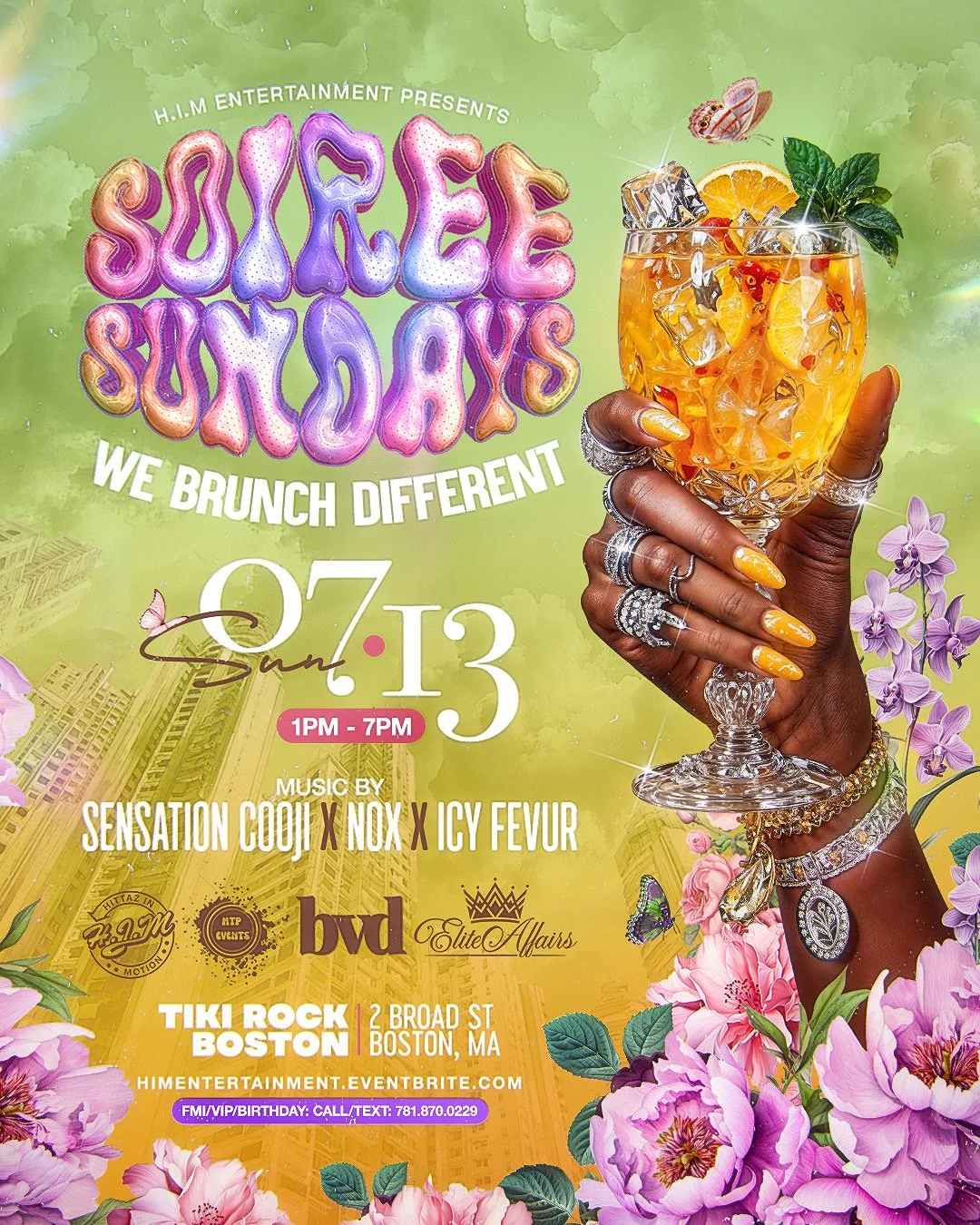 SOIREE SUNDAYS Sunday, July 13, 2025 1:00 PM 7:00 PM 13:00 19:00 Tiki Rock 2 Broad Street Boston, MA, 02109 United States (map) Google Calendar ICS MUSIC BY COOJI | ICY FEVUR | NOXVIP/FMI TEXT 617-309-8634 Buy Tickets on Eventbrite Buy Tickets